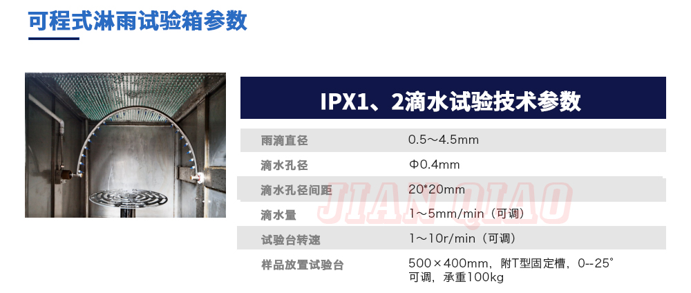 產(chǎn)品型號:IPX-1234 品牌:劍 喬 用途:可程式淋雨試驗箱適用于電工電子產(chǎn)品(包括組件)、燈具照明產(chǎn)品、汽車摩托車零部件外殼和密封件等產(chǎn)品做外殼防護(hù)等級測試(IP 防水等級試驗),模擬其產(chǎn)品在運輸和使用期間可能受咨詢熱線:13829135130